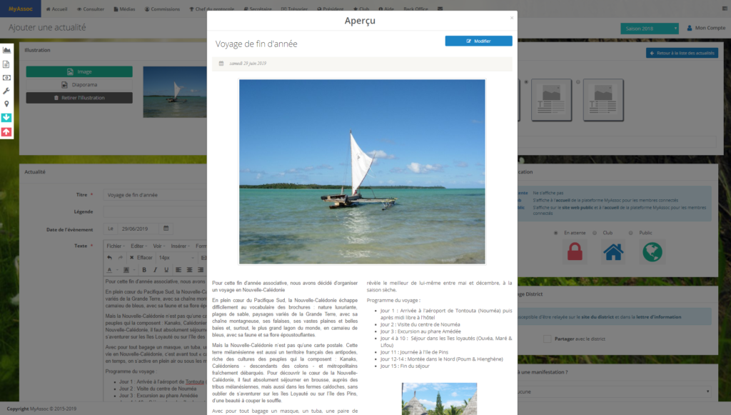 La possibilité de partager son actualité afin que celle-ci soit relayée sur le site web public et de l’infolettre district/régionale/nationale se place désormais sur la gauche de l’écran. Il suffit comme auparavant de cocher la case « Partager ».