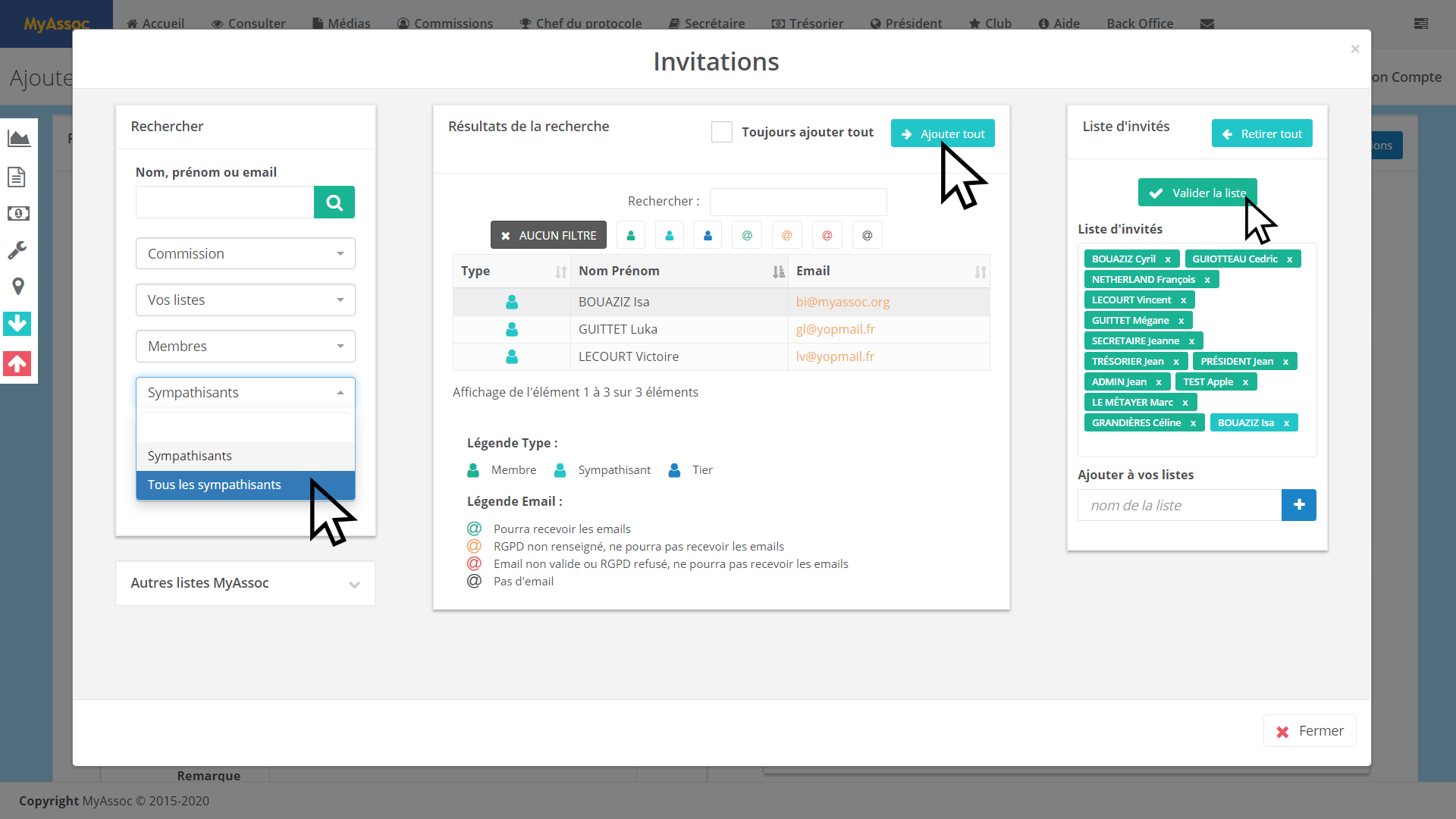 Pour les réunions statutaires, les invités sont par défaut les membres du club mais vous pouvez modifier cette liste en cliquant sur le bouton « Modifier la liste ».