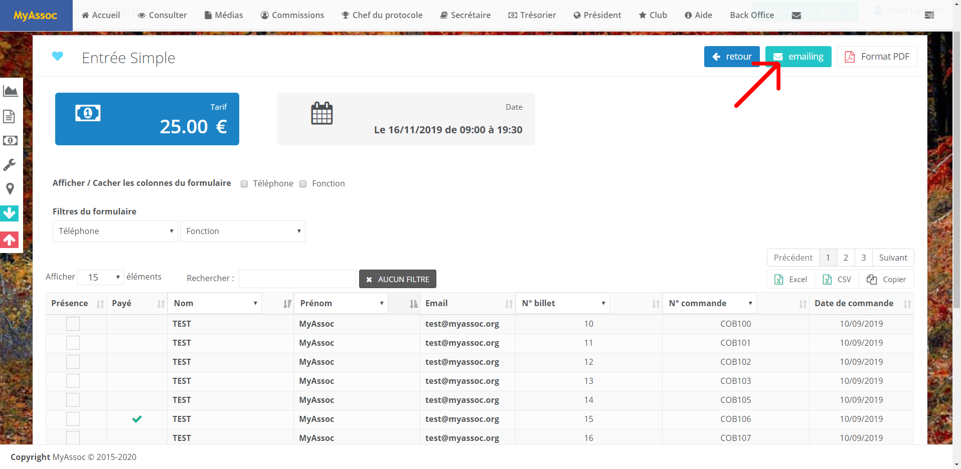 Les listes des participants à une prestation se présentent sous forme de tableau qui peuvent être filtrées selon différents critères (téléphone, adresse, fonction dans le club ou l’asso, …).